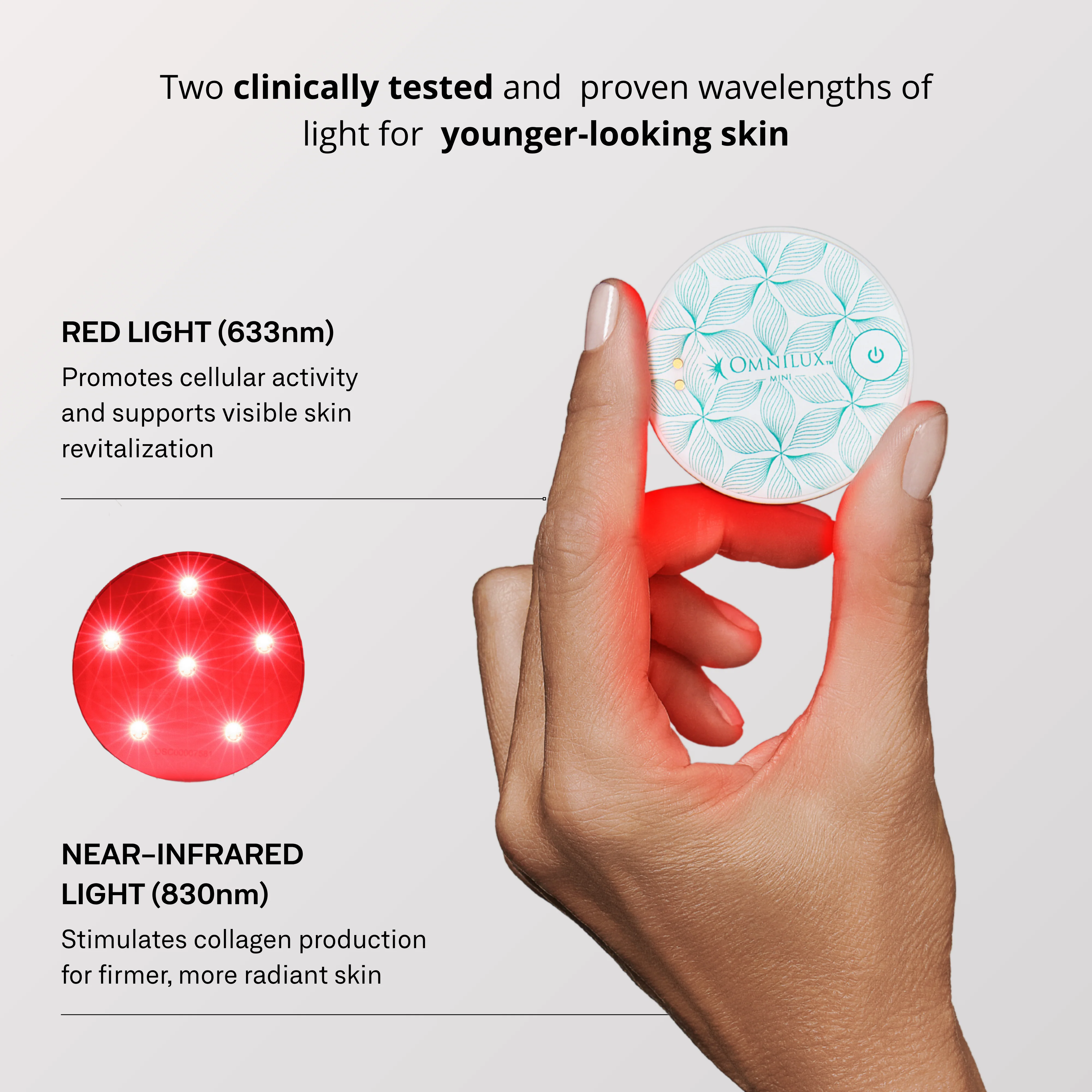 Target fine lines, age spots, and inflammation with Omnilux’s medical-grade, dermatologist-recommended red light therapy Mini device.